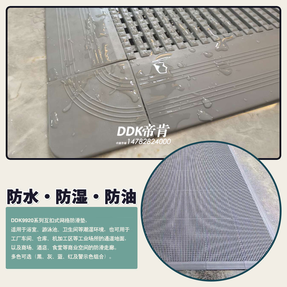 优良品质组合型止滑塑胶地垫的代表: DDK品牌止滑疏水型塑胶地垫系列DDK安全步行区防潮湿止滑地垫是淋浴区、更衣室,室内和室外泳池,水疗、桑拿浴室或任何其他多水地区的理想地垫系统!它在增强安全的基础上,其开放的背部设计排水良好。同时,耐油。防止意外滑倒摔伤。脚感舒适